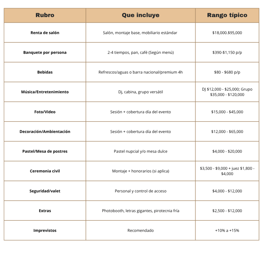 En Ciudad Juárez, una boda en 2025 suele costar entre $150,000 y $600,000 MXN según número de invitados, menú y entretenimiento. El mayor impacto en tu presupuesto son: banquete por persona, bebidas y salón. Aquí te dejamos una tabla con precios orientativos y ejemplos completos para que avances con números reales.